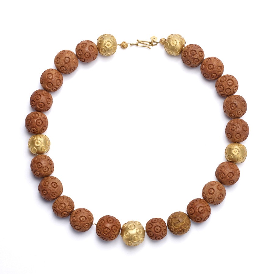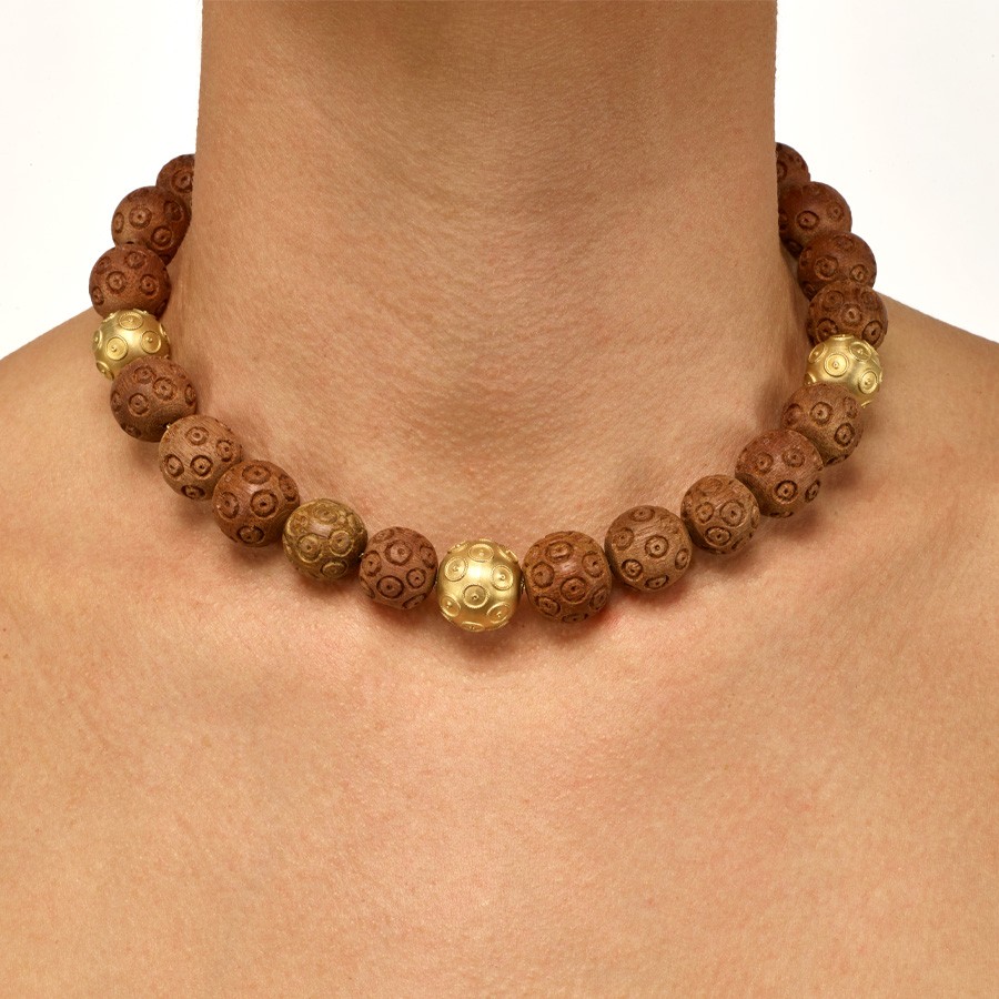Colar confeccionado em ouro amarelo fosco e madeira esculpida.