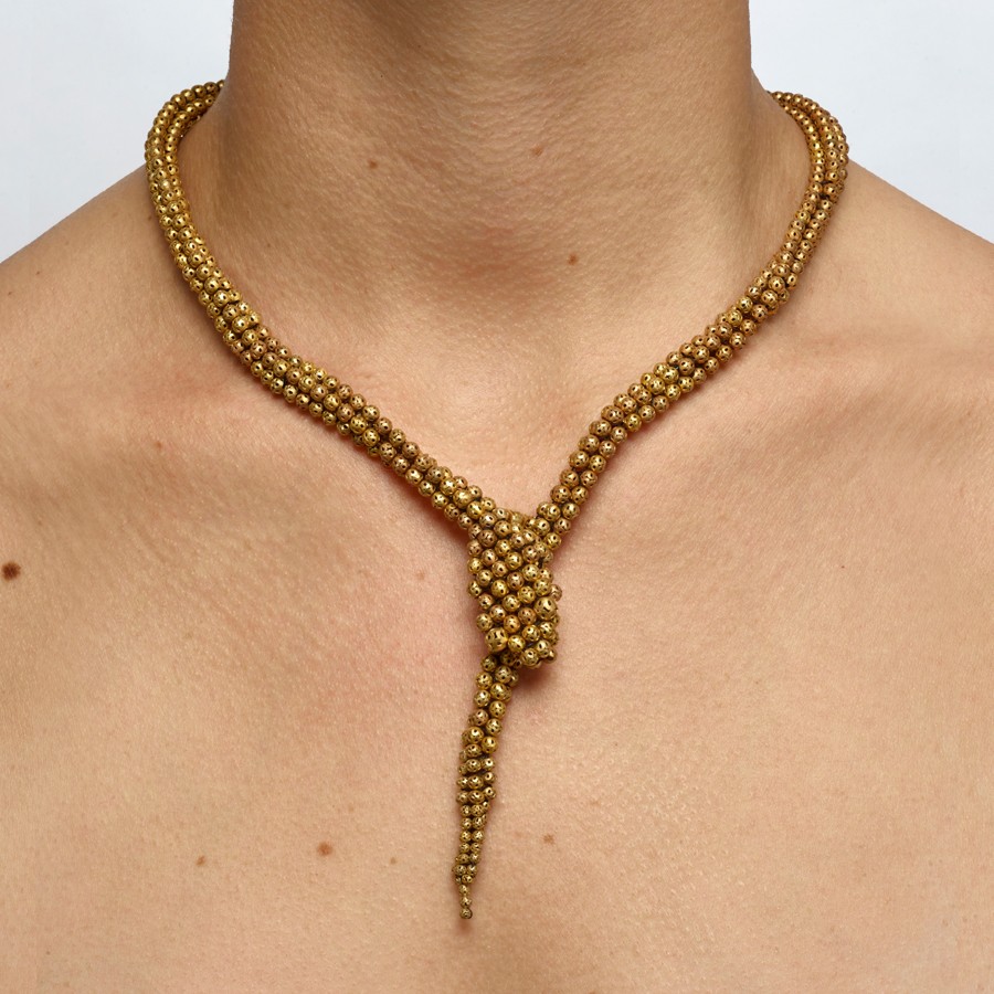 Colar confeccionado em ouro amarelo fosco. Disponível também em ouro branco.