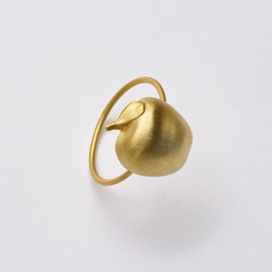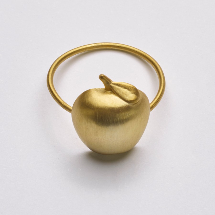 A coleção apresenta a pêra, a uva e a maçã em versões como brincos, colares e pingentes esculpidas em madeira e pintadas à mão, com interferências em ouro amarelo ou branco, ou versões das frutas apenas em ouro.