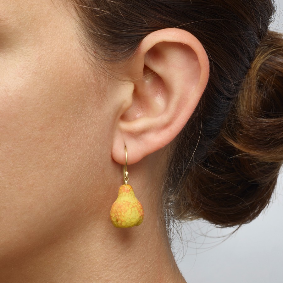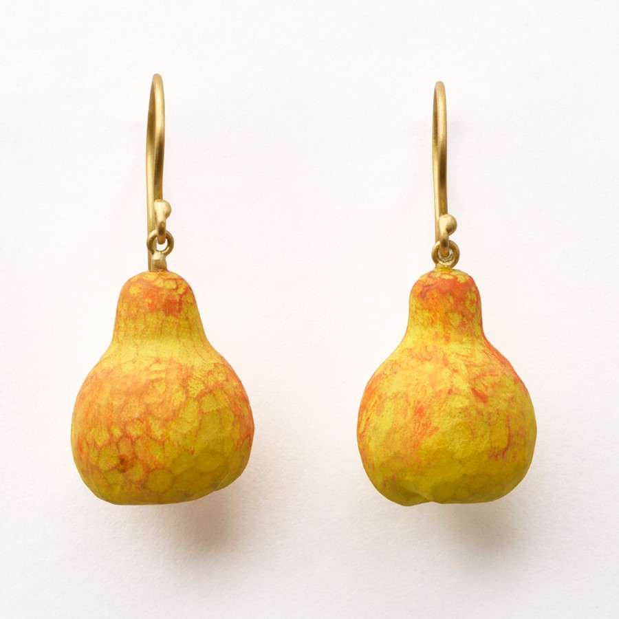 A coleção apresenta a pêra, a uva e a maçã em versões como brincos, colares e pingentes esculpidas em madeira e pintadas à mão, com interferências em ouro amarelo ou branco, ou versões das frutas apenas em ouro.