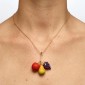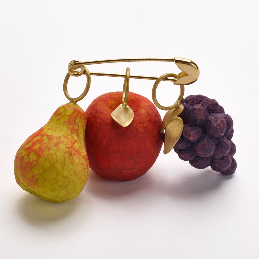 A coleção apresenta a pêra, a uva e a maçã em versões como brincos, colares e pingentes esculpidas em madeira e pintadas à mão, com interferências em ouro amarelo ou branco, ou versões das frutas apenas em ouro.