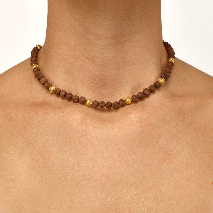 Colar confeccionado em ouro amarelo e madeira misturando contas confeitadas (filigranadas) e contas esculpidas na madeira com mesmo desenho. Disponível também em ouro branco.