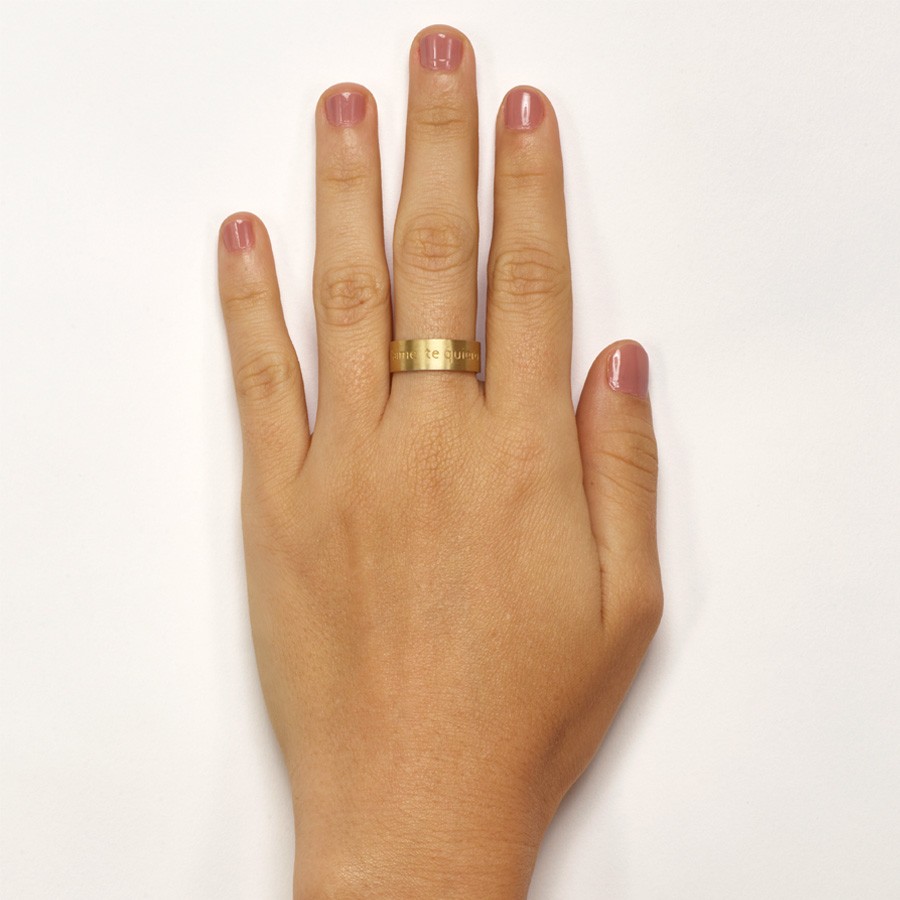 Anel em ouro amarelo fosco, com a frase "Te amo" em português, francês, inglês e espanhol. Disponível também em ouro branco.