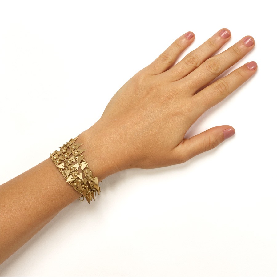 Símbolo da cultura punk, o spike foi unido a elementos delicados em ouro amarelo fosco. Disponível também em ouro branco.